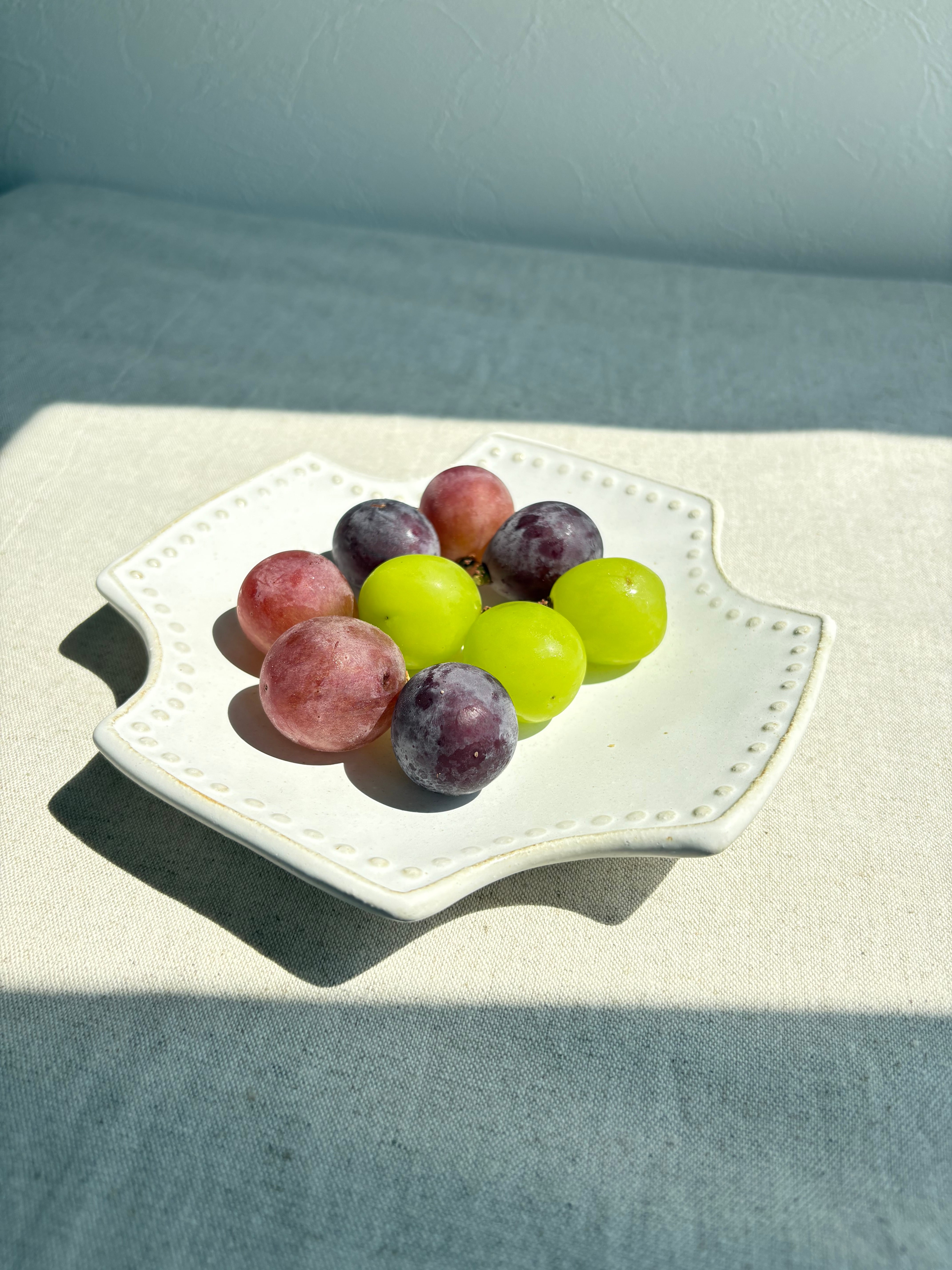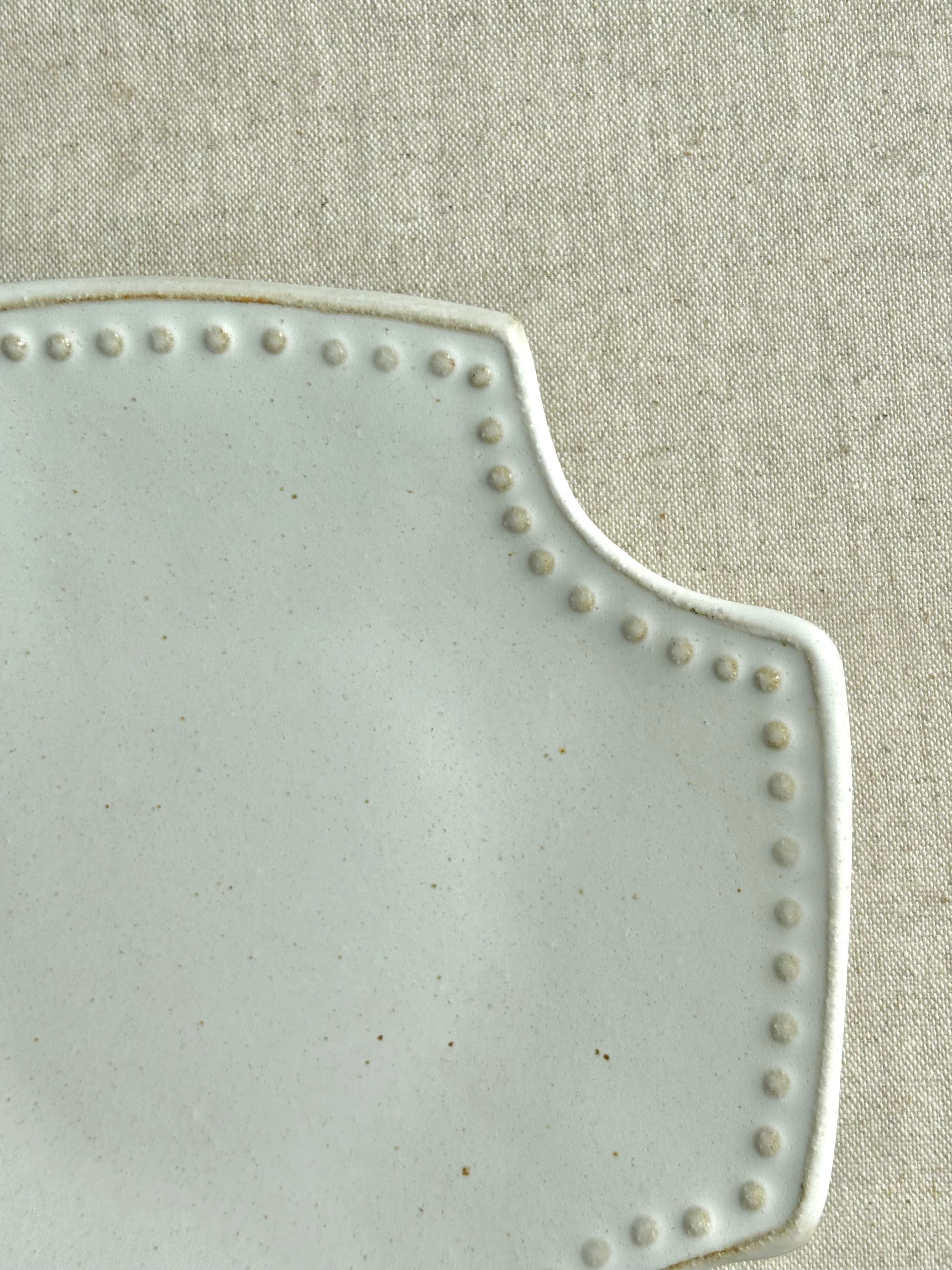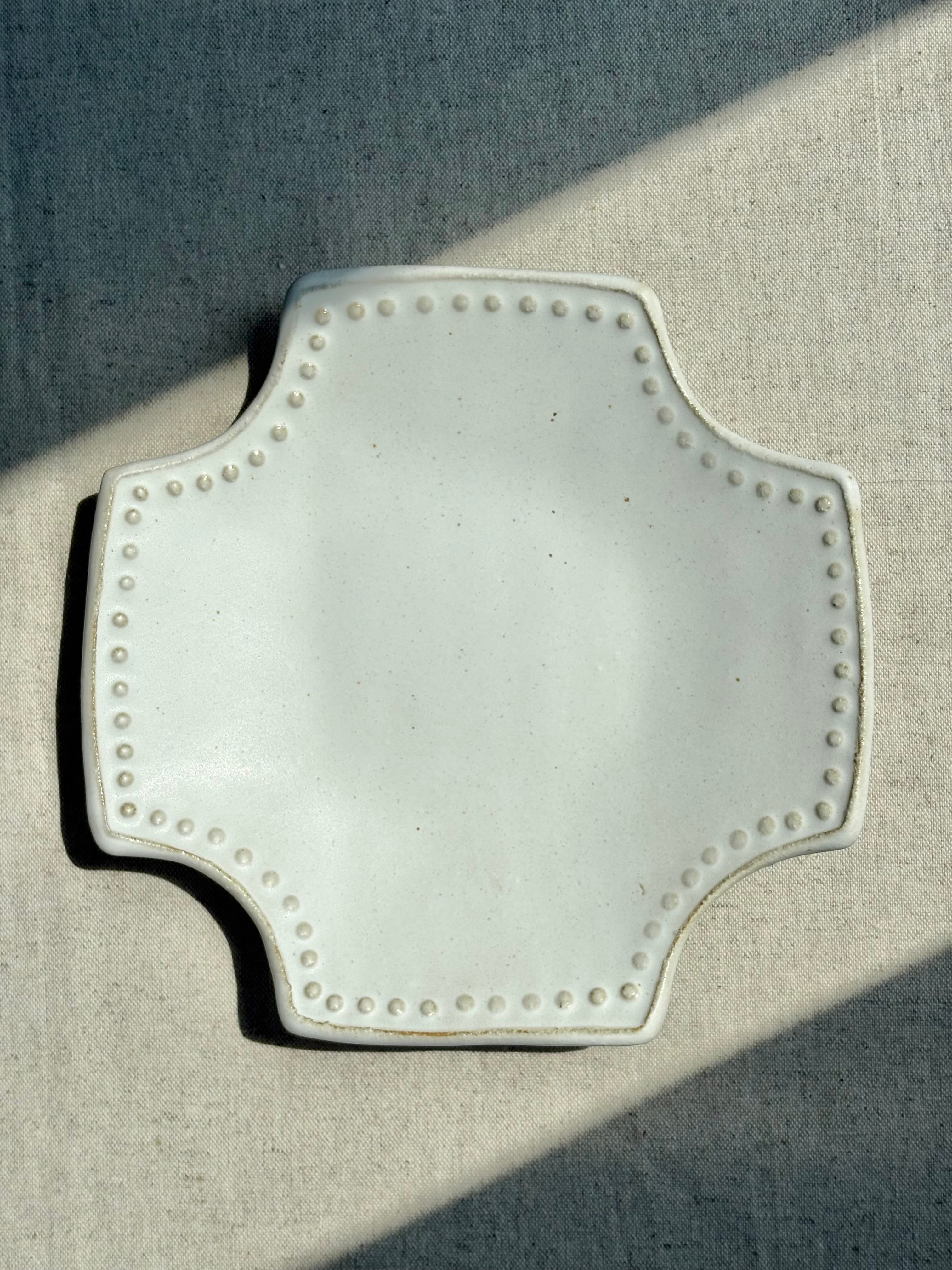 ふちのドット模様がかわいい!おしゃれなクロス型のプレートです。マットな白色の釉薬で、シンプル&ナチュラルな仕上がり♪
