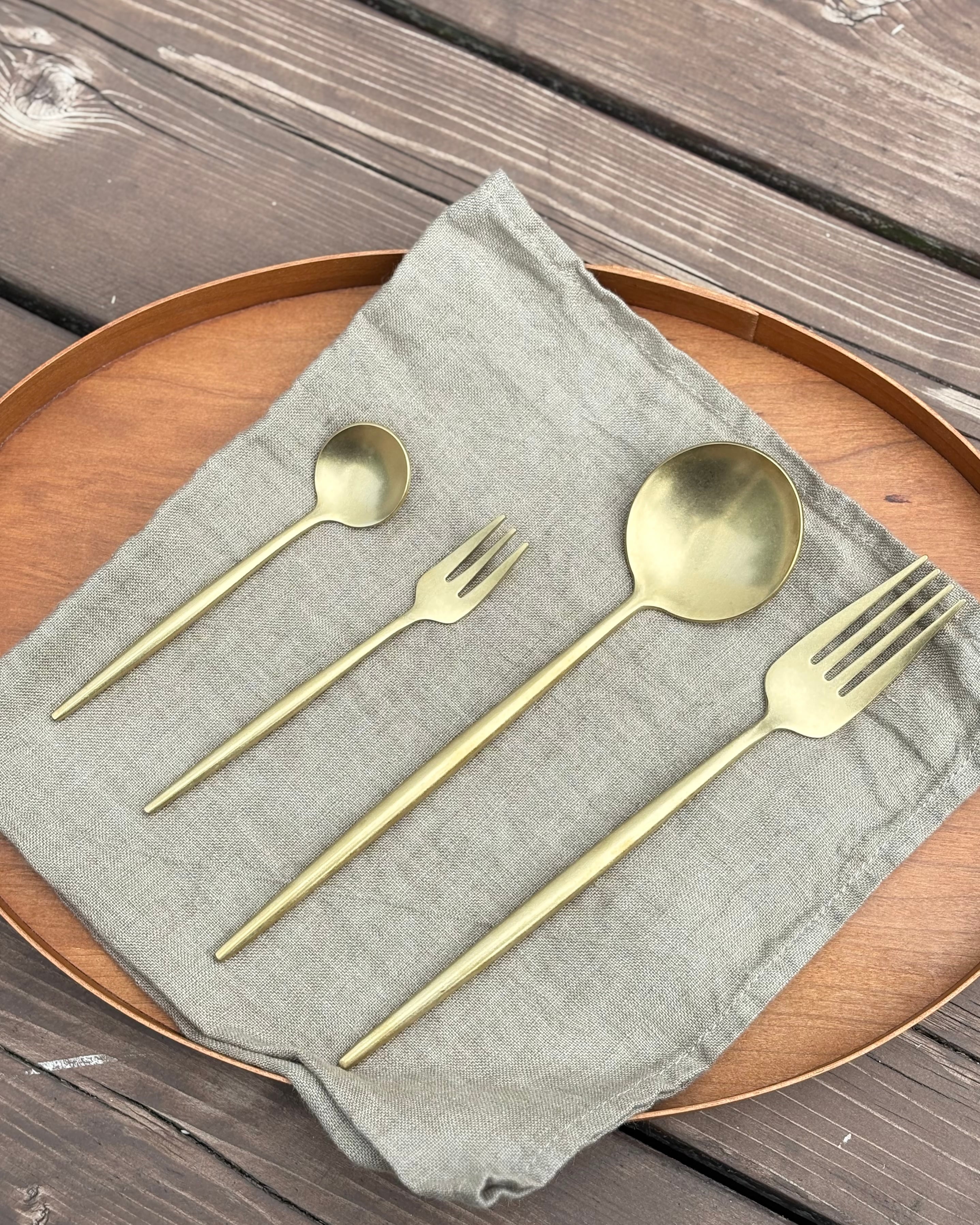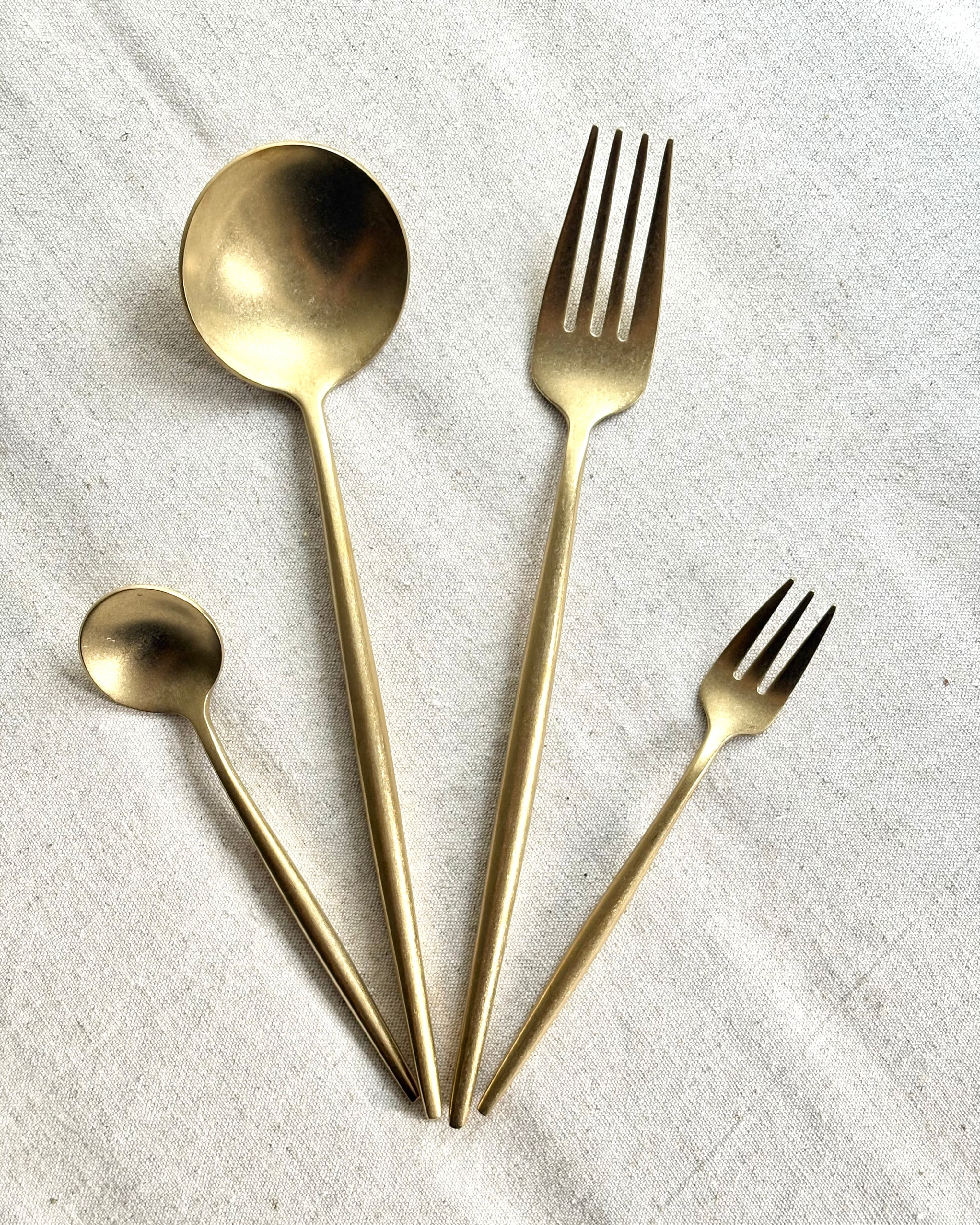 つや消し仕上げを施した、特別感のあるゴールドのカトラリー。研磨加工によるマットなつや消しの表情が、ゴールドカラーと相まって上質感を演出してくれるカトラリーです。