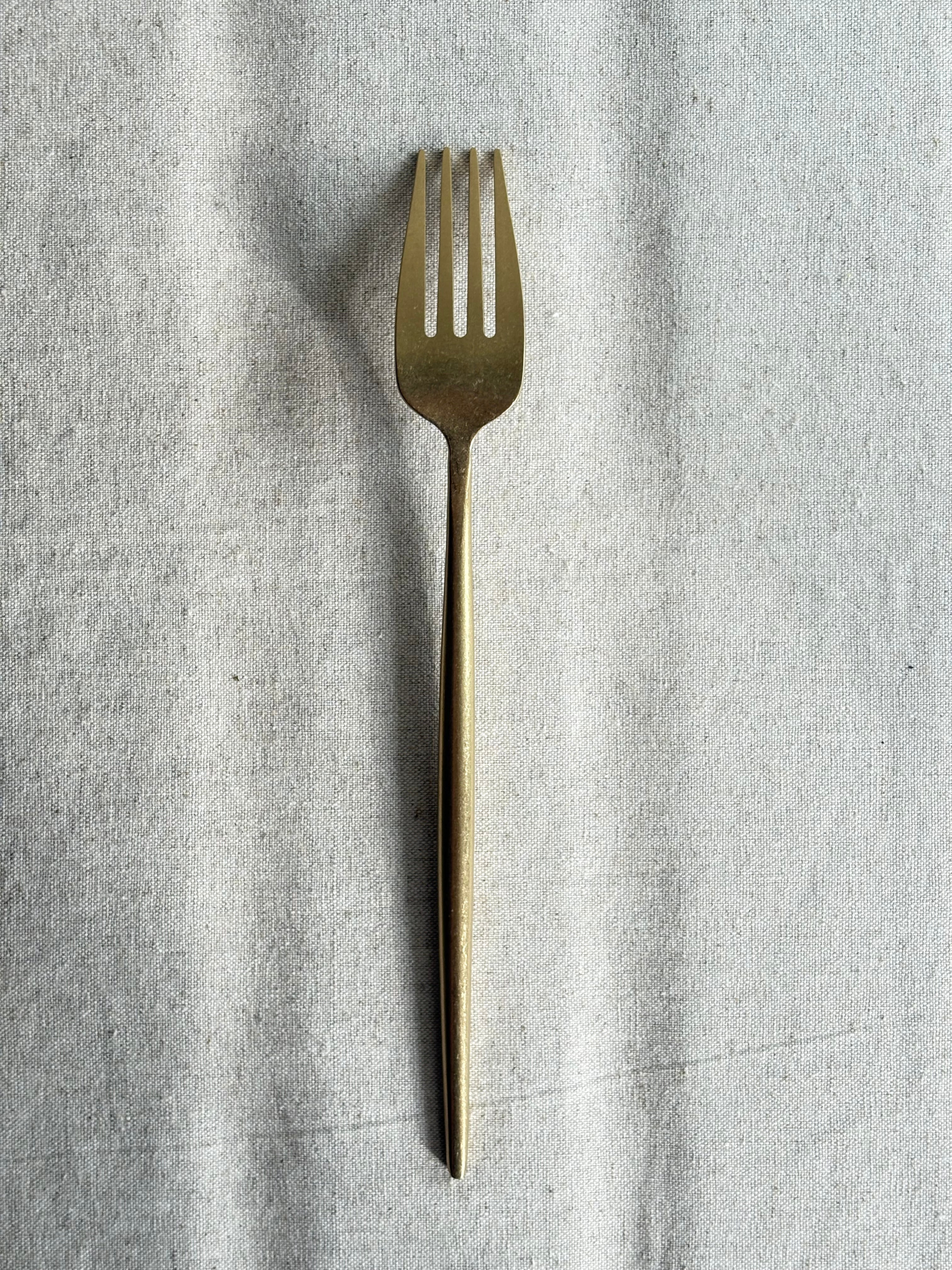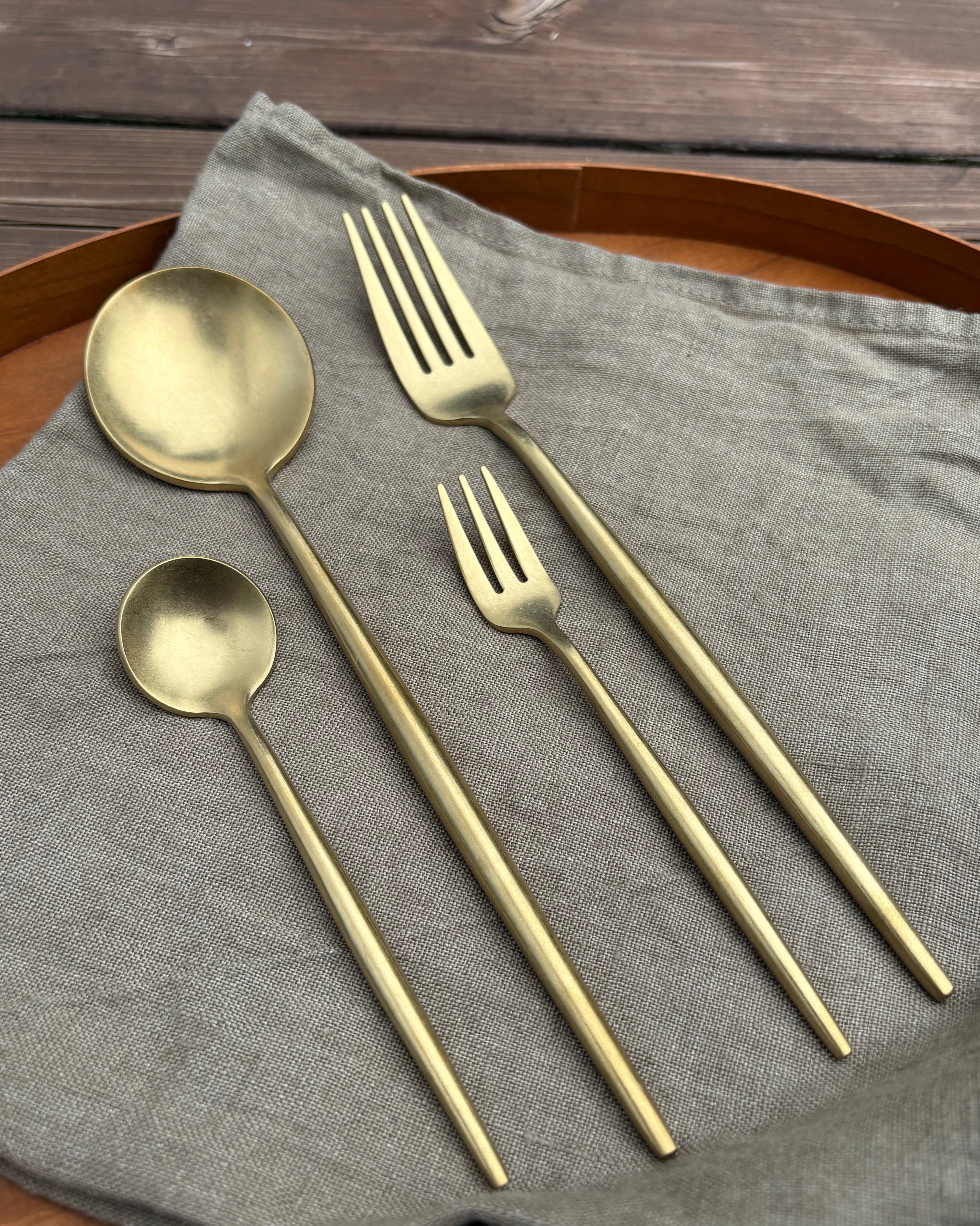 研磨加工によるマットなつや消しの表情が、ゴールドカラーと相まって上質感を演出してくれるカトラリーです。