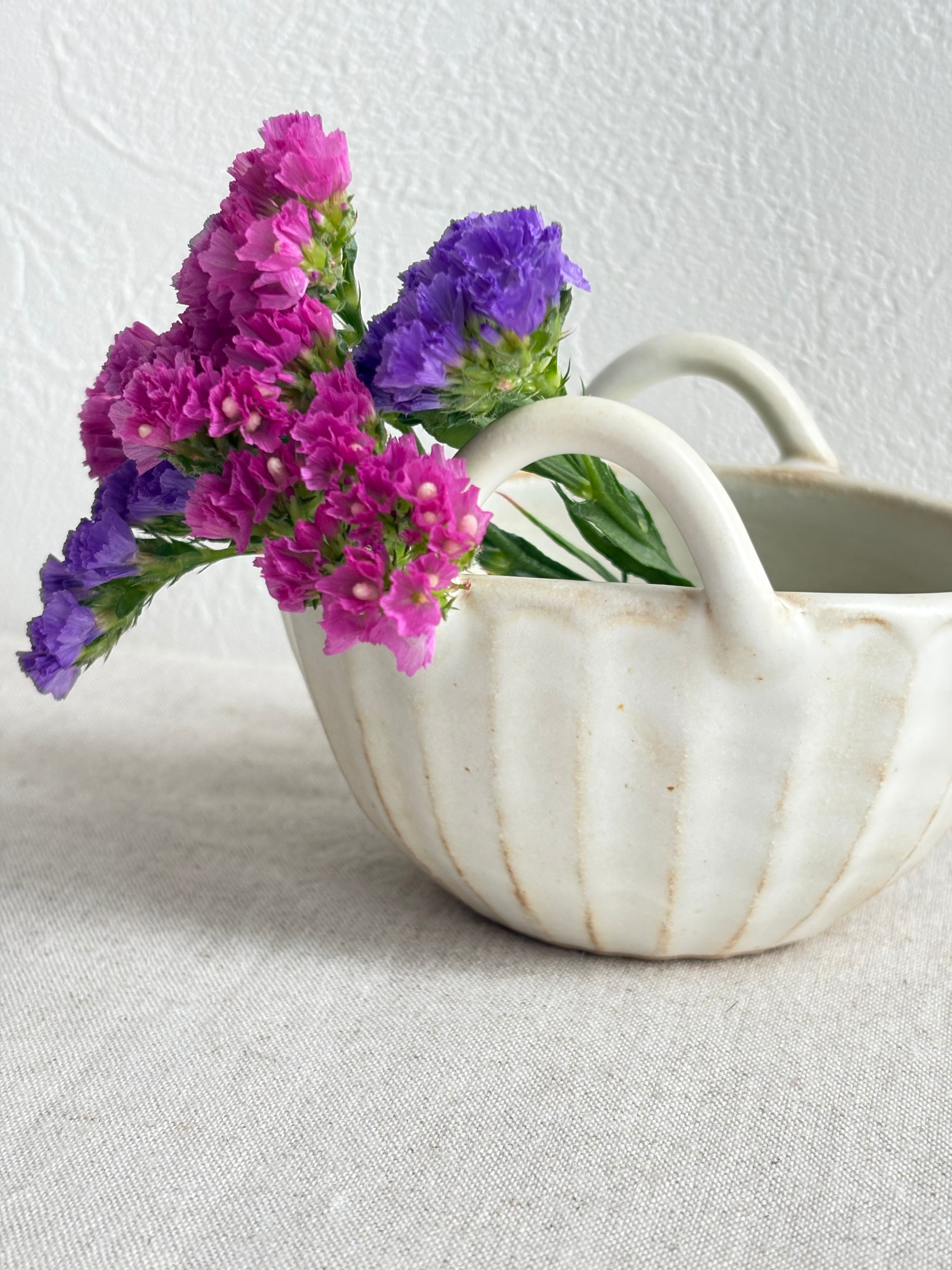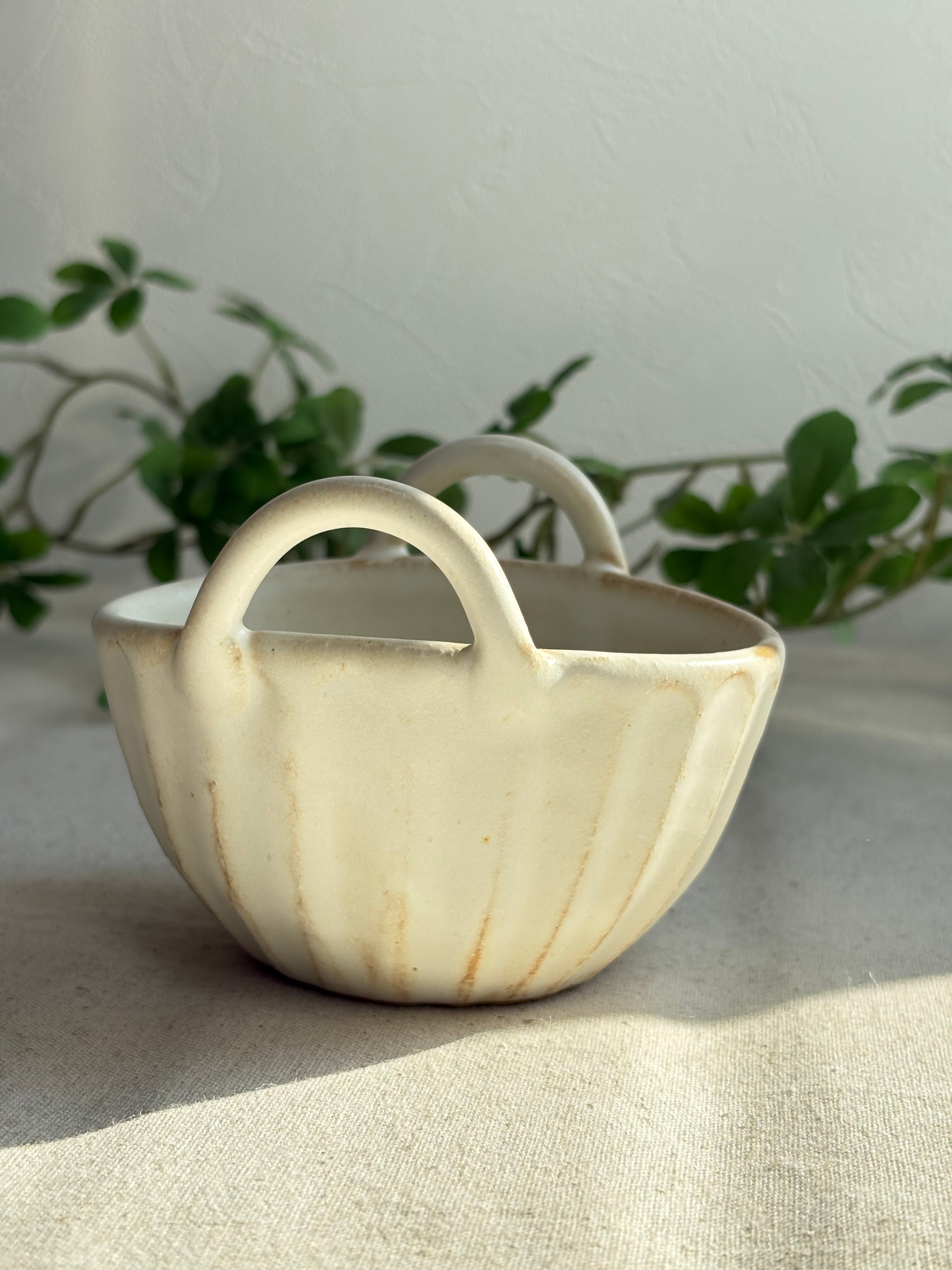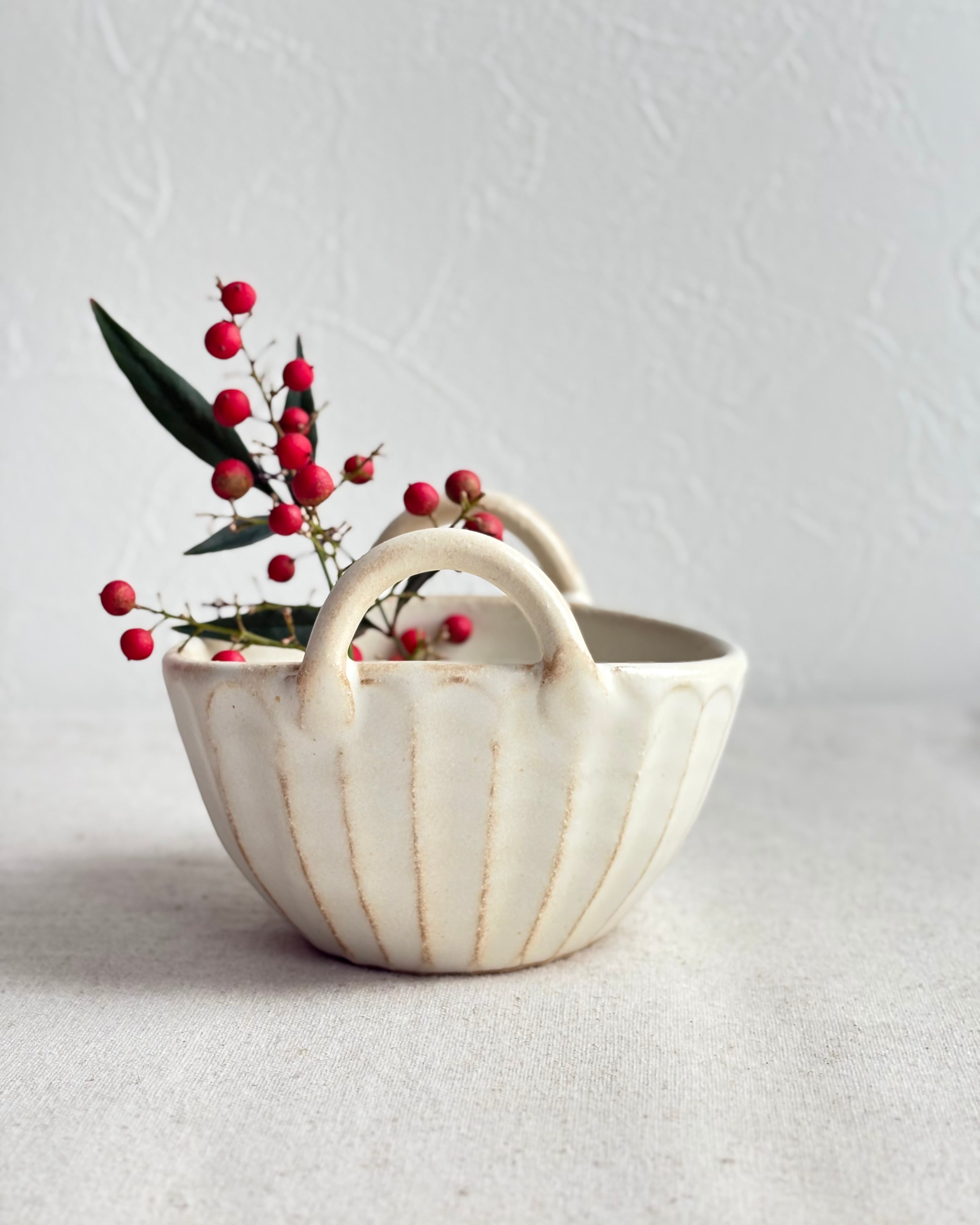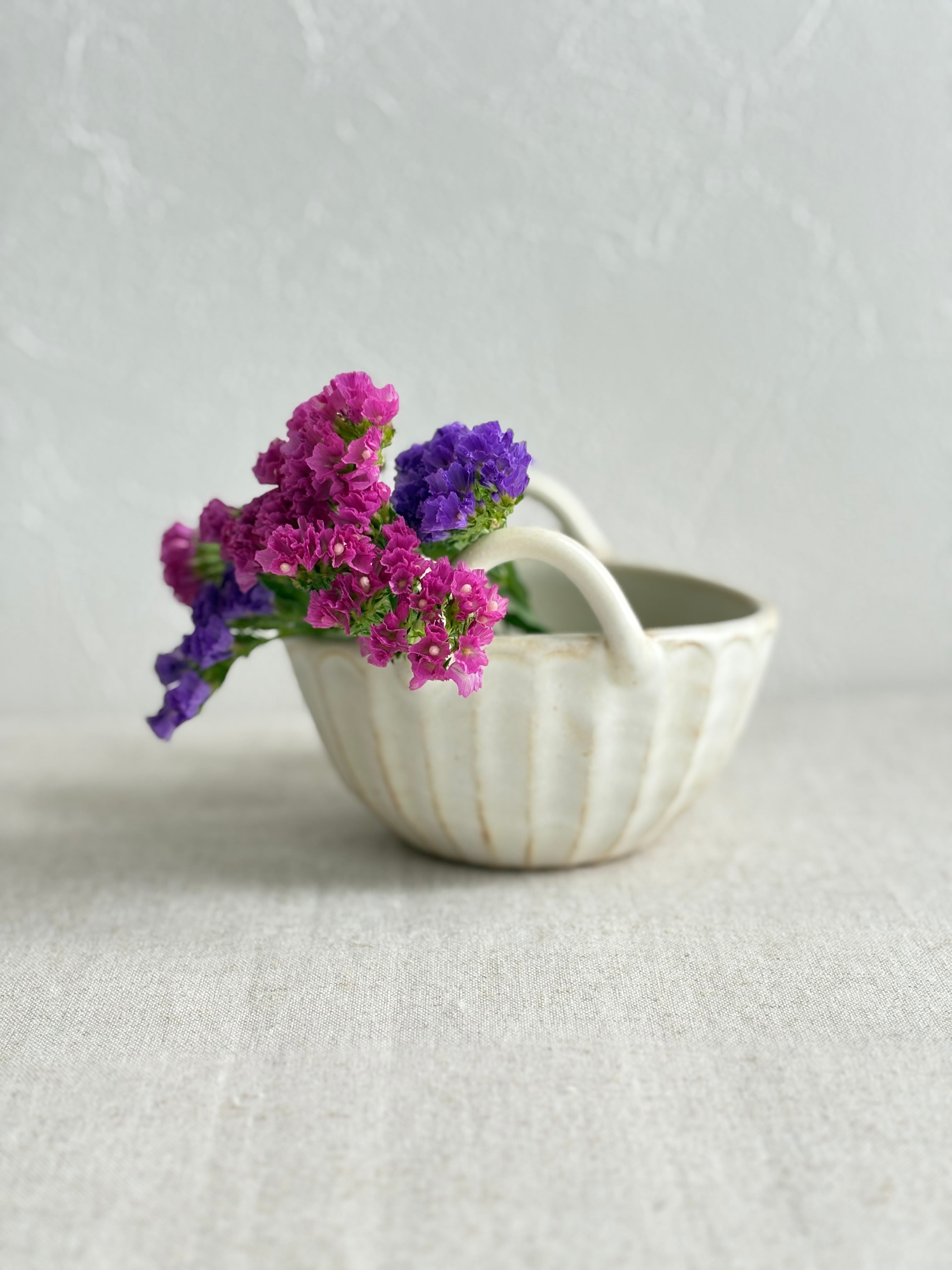 ミニチュアの花かごのようなかわいらしいデザインです。独特のマットな質感からは、自然の温もりが感じられます。
