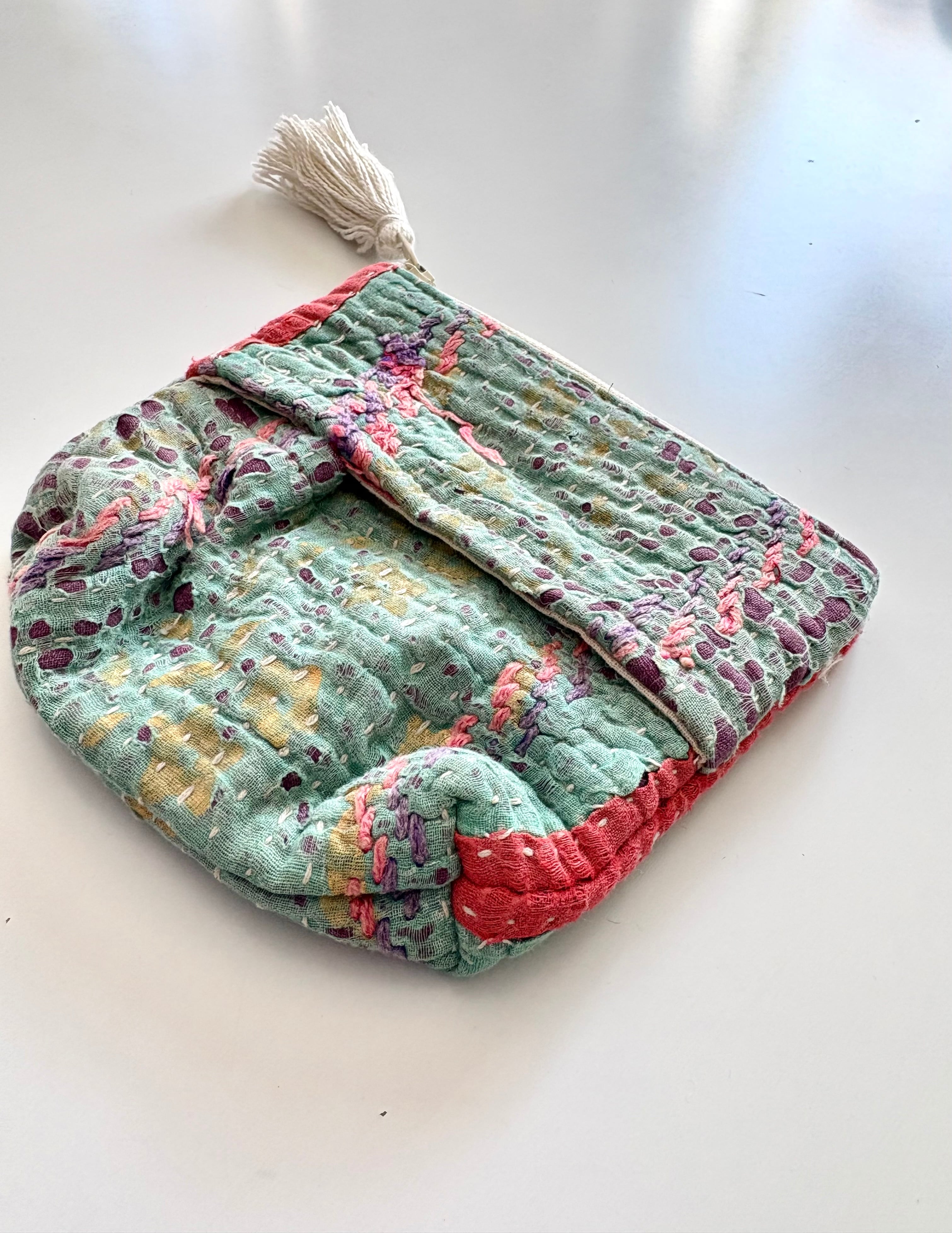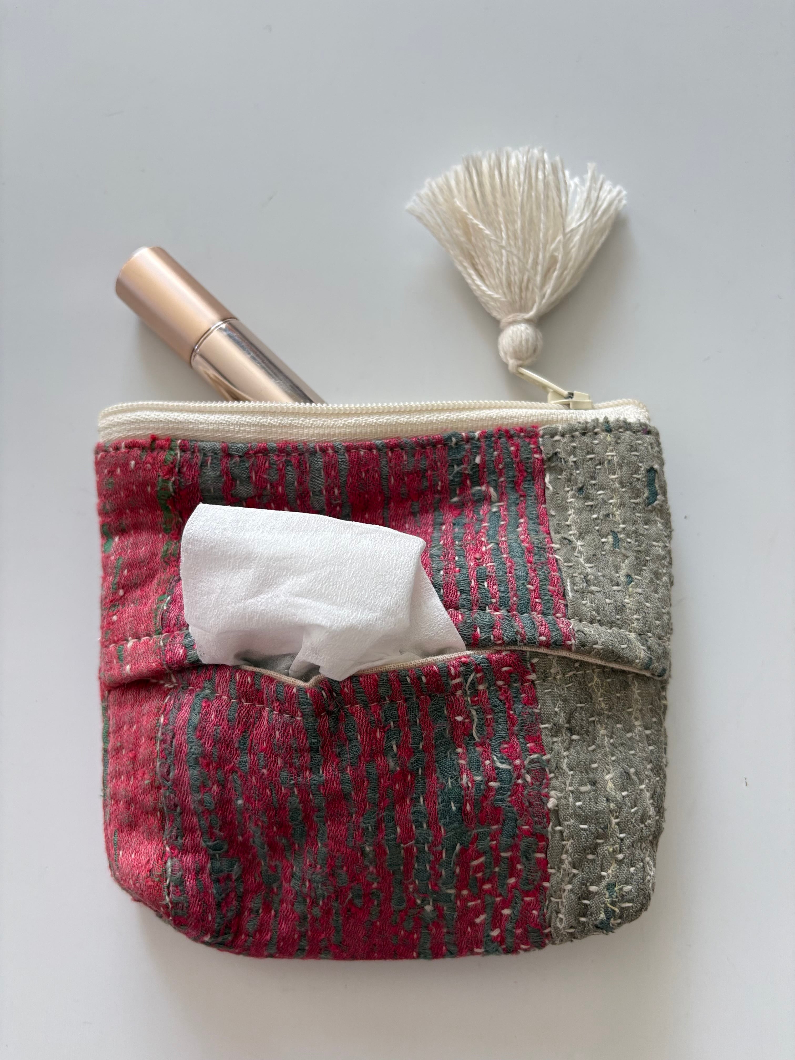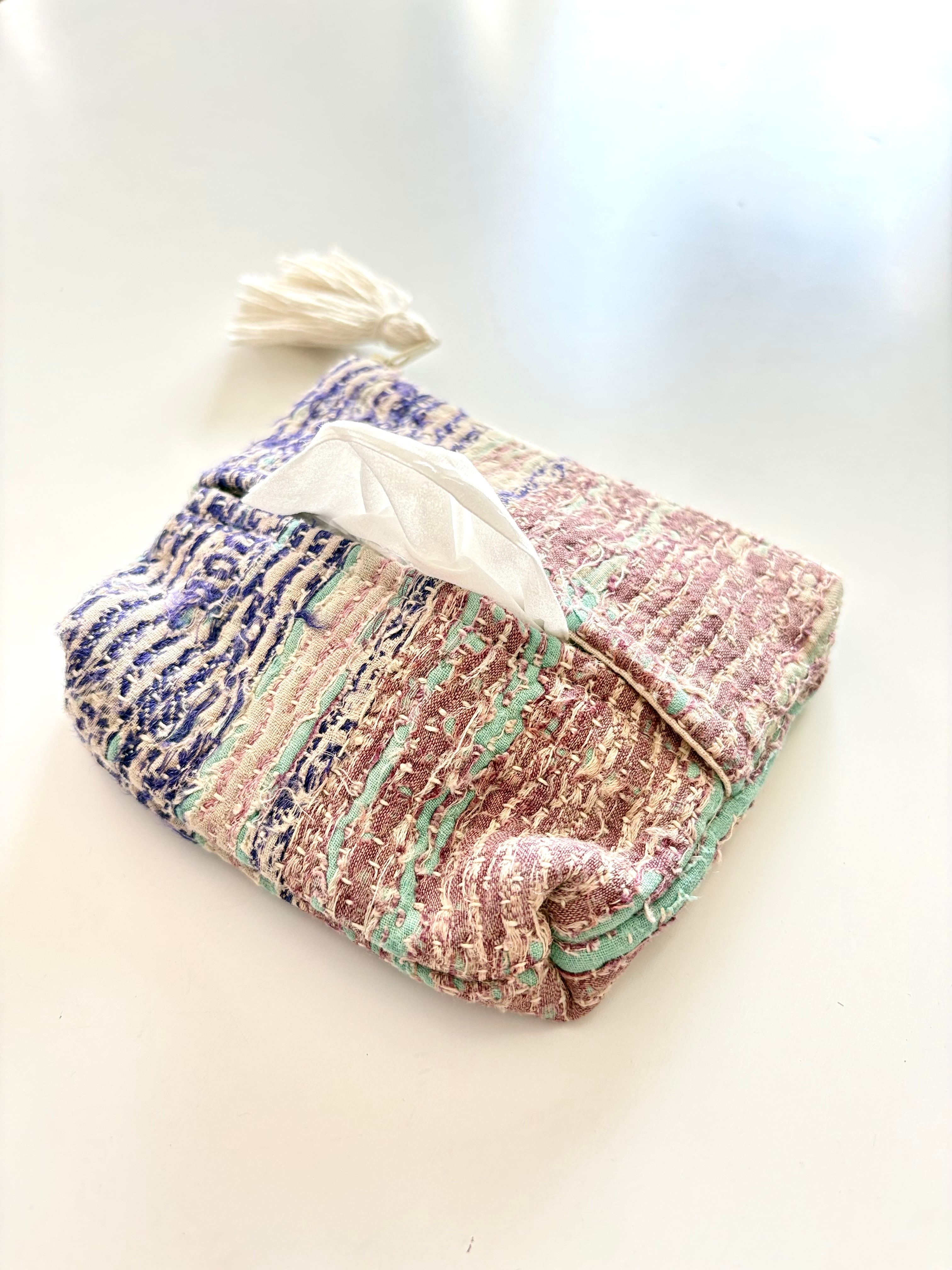 オンリーワンデザイン(すべて一点もの)のカンタ刺繍を施したティッシュケース付のポーチです。