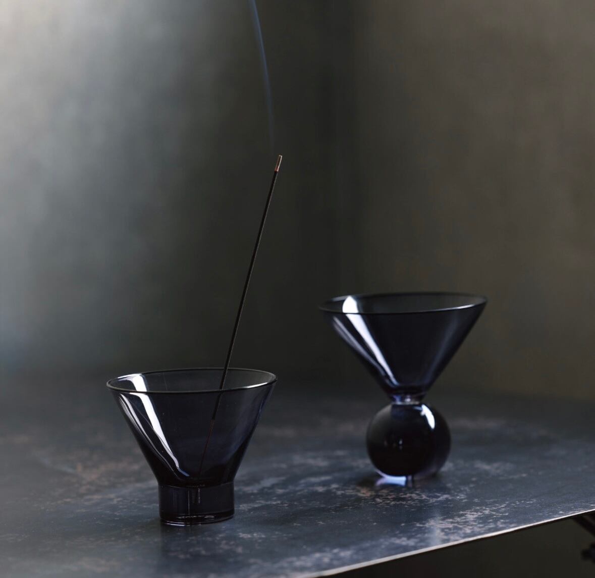 こちらはインテリアブランド " HUNT9 "のインセンスホルダーです。グラスのフォルムはうっとりする美しさ。円形の土台がとてもおしゃれです。